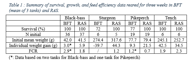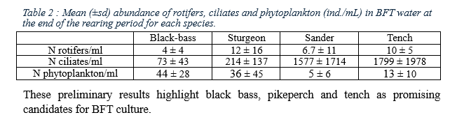 These preliminary results highlight black bass, pikeperch and tench as promising candidates for BFT culture.