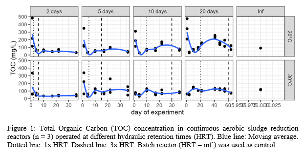 The optimum hydraulic retention time (HRT) for continuous sludge reduction was determined at two different temperatures (20°C and 30°C) and four HRT levels (2 d, 5 d, 10 d, 20 d), with a batch treatment as control. Water exchanges were carried out daily with exchange water set to the pre-determined maximum TS concentration. Experiments were run until at least 3 times HRT was reached.