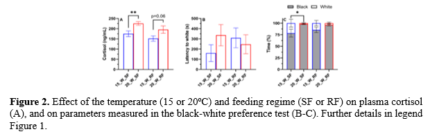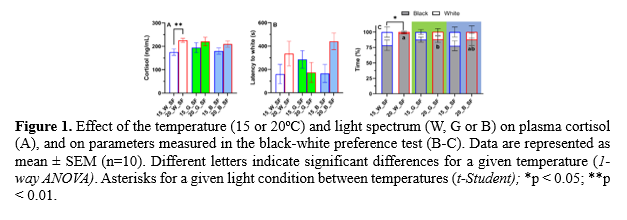 Juvenil e trout (3,7±0,3 g weight and 6,7±0,2 cm length) were homogene ously distributed into eight independent experimental groups by duplicates , with different rearing conditions by combining different temperatures (15 or 20ºC), light spectrum [white 380-750nm (W); green 495-570nm (G); or blue 450-494nm (B)] and feeding regime (SF or RF, scheduled or random feedings, limited to white light and at 15ºC) . T he following experimental groups were established: 15_W_SF; 20_W_SF; 15_G_SF ; 20_G_SF; 15_B_SF; 20_B_SF; 15_W_RF; 20_W_RF. During the experimental period, fish were reared under a 12D: 12L photoperiod and daily fed at 3% of body weight . A fter 35 d ays, black-white preference tests were performed to assess anxiety-like behavior and blood samples were taken to measure cortisol. At the end of the experimental period (45 days), ten fish per treatment were euthanized with a lethal dose of MS-222 (400 mg/L) to collect hypothalamus and liver for RNAseq analysis focusing on genes related to stress, energy balance and photoreception. In addition, another group of fish for each treatment was sacrificed during a 24-hour period (every 4 hours) to sample blood, hypothalamus, pituitary and head kidney to measure cortisol and clock gene expression daily rhythms. Lastly, ex vivo skin explants from dorsal and ventral regions were examined to assess permeability to absolute irradiance (EI) with a spectroradiometer.