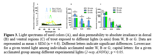 Temperature was the only condition that significantly increased plasma cortisol levels (Figs. 1A, 2A). This effect was not observed in fish reared under G or B lights, or under W light between SF or RF, possibly due to already elevated basal cortisol levels. Overall, fish exposed to 20ºC tend to exhibit longer latency to enter the aversive white area in the black-white preference tests and spend less time in it (Figs. 1B,C and 2B,C) , suggesting increased anxiety under such conditions . Interestingly , at 20ºC, time spent in the aversive white area was diminished in fish under G compared to W; B presented intermediated values (Figs 1C). Remarkably, G light and RF condition did not highlight differences between 15 and 20ºC indicating already heightened anxiety. W e confirmed the lights spectrum (Fig. 3A) and characterized skin permeability to absolute irradiance (EI) under each treatment . For the dorsal region, B light significantly increased EI permeability (Fig. 3B), whereas the ventral region showed reduced EI permeability (Fig. 3C).