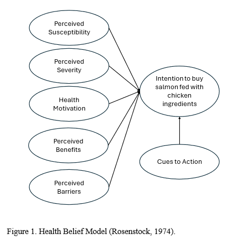 The salmon industry is seeking alternative protein sources to include in feed formulations. Fishmeal and soy protein, currently the primary protein sources in salmon feed, are criticized for their environmental impacts. However, finding an alternative protein source that is available in high volumes, cost-competitive, nutritionally adequate, and environmentally sustainable remains challenging. In this context, processed animal protein from chicken could represent a promising alternative. Nonetheless, consumer acceptance of integrating chicken into salmon feed remains a concern. European consumers may perceive feeding salmon with land-animal ingredients as unhealthy or unnatural. This study investigates how consumers’ health beliefs about salmon fed with chicken ingredients influence their acceptance of such products. The Health Belief Model (Rosenstock, 1974) is the theoretical framework to explore these relationships (Figure 1) .
