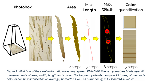 Manual workflow: … After the harvest of at least 100 individual blades of macroalgae, per length of cultivation substrate, the algae are cooled if not processed immediately. For the picture taking, the algae blades are placed manually onto a white background underneath the custom-built photo box. Length and/or colour scales, as well as metadata, are included. Digital workflow: … custom-written scripts for ImageJ/Fiji and Excel/VBA have been in-house developed to automate almost all necessary steps to measure and visualise the parameters of interest (blade area, maximum length, maximum width and RGB colour), with minimal observer interaction. …