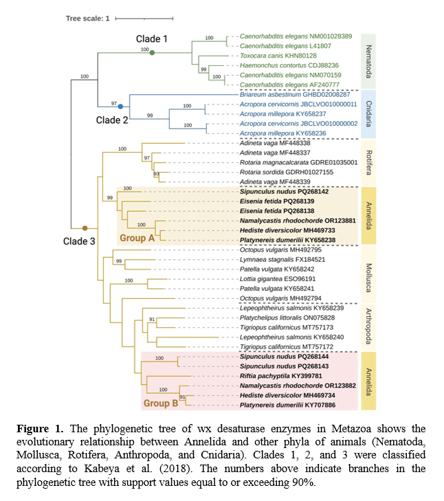 Long-chain (≥C20) polyunsaturated fatty acids (LC-PUFA) are essential nutrients with critical roles in neural function, immune regulation, and cellular membrane structure (Tocher et al., 2019). With increasing demand for sustainable LC-PUFA sources in aquaculture, especially for formulating nutritionally enriched feeds, exploring new biological systems capable of de novo LC-PUFA synthesis has become a critical research priority (Tocher et al., 2019). While vertebrates predominantly rely on dietary intake for LC-PUFA, certain invertebrates, including aquaculture-relevant annelids such as Hediste diversicolor and Platynereis dumerilii, possess endogenous biosynthetic pathways involving methyl-end desaturases (ωx), front-end desaturases (Fed), and elongases (Elovl) (Monroig et al., 2022). Among these, the diversity and functionality of ωx desaturases in Annelida remain underexplored (Kabeya et al., 2018). This study investigated the diversity and function of ωx desaturases in annelids across three major classes in Annelida: Polychaeta, Clitellata, and Sipuncula.