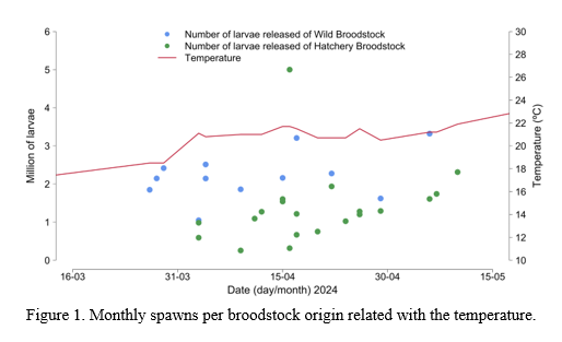 Spawning followed natural thermal cycles, producing a total of 36 spawns and 59.8 million larvae, 48% of which originated from HB (Figure 1) . These findings confirm for the first time that individuals bred in hatchery in 2022 (Hernandis et al., 2023) are reproductively viable. Larvae from WB were significantly larger (mean = 168.5 µm) than those from HB (mean = 153.3 µm), and their survival to settlement was also higher (54% vs. 21%, respectively). However, the survival rate to postlarvae stage was higher (24% ) for those larvae from HB than those from WB (16%) . The observed differences in fecundity and larval performance are consistent with age-related reproductive maturity: WB individuals were older and fully mature possessing greater energy reserves and more developed gonads , whereas HB were in their first reproductive cycle after reaching sexual maturity. This may influence reproductive outcomes, with older individuals typically having larger energy reserves and more developed reproductive organs (Bayne, 2017) .