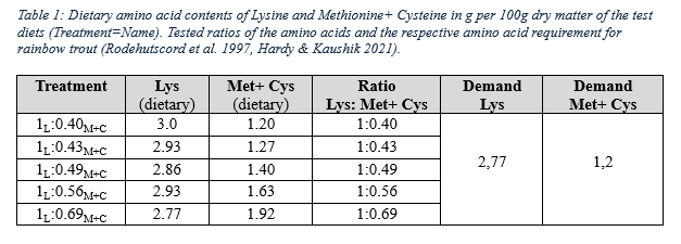 Fishmeal is still one of the main protein sources in fish feed, but its increasing demand can only be covered by sustainable aquaculture that uses alternative protein sources (FAO, 2022; Hua et al., 2019; Sarker et al., 2020). Therefore, in this project, raw materials that were suitable for organic production were used. Altho ugh plant-based protein sources have been tested as substitutes for fishmeal, these often have negative effects on digestion, taste, and growth due to a suboptimal amino acid composition (de Francesco et al., 2004; Francis et al., 2001; Lazzarotto et al., 2018; Kaiser, 2021; Nagel et al., 2012; Slawski, 2012) . There are also indications that an amino acid imbalance could reduce feed intake (Bak et al., 2012; Comesaña et al., 2017; Comesaña et al., 2020 ). The purpose of this study was to test raw materials as fishmeal substitutes to investigate the influence of varying Lys to Met+ Cys ratios above demand, because it is assumed that these higher ratios can positively affect feed intake and growth.