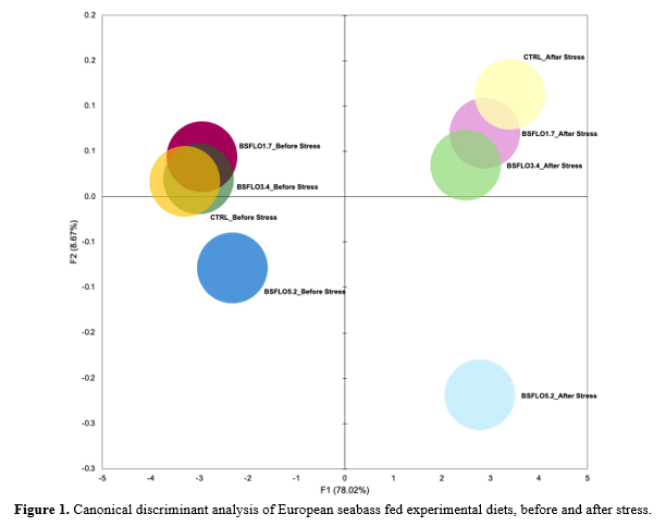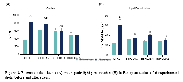 A control diet (CTRL) was formulated with 6% fish oil and 5% poultry oil (PO). Three other experimental diets were formulated to include 1.7%, 3.4% and 5.2% of BSFLO, supplied by Entrogreen® - Ingredient Odissey S.A. (BSFLO1.7, BSFLO3.4 and BSFLO5.2, respectively), at the expense of PO. Each diet was assigned to triplicate homogeneous groups of 50 fish (11 ± 0.1 g) that were fed until apparent satiation three times daily for 12 weeks. Fish were subjected to a 12-hour light/12-hour dark photoperiod regime and kept in a recirculating saltwater system (35‰, 23 ± 1 °C). By the end of the trial, 5 fish per tank (15 per dietary treatment) were sampled for analysis of metabolic and oxidative stress response-related parameters, and other 5 fish per tank were exposed to an acute stress episode consisting of 1 min air exposure and 14 min overcrowding (100 kg/m3) followed by 90 min of recovery before sampling. Plasma cortisol levels, along with plasmatic and hepatic metabolites (e.g., glucose, lactate, triglycerides, among others) were quantified. Additionally, lipid peroxidation and the activity of oxidative stress-related enzymes (e.g., superoxide dismutase, catalase, and glutathione peroxidase, and others) were measured. Growth performance and feed efficiency were also evaluated.