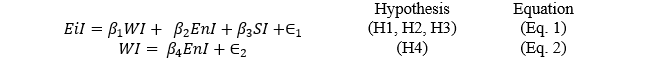 is the error term. The relationships are linear regressions within the structural model. In Eq.1, economic and welfare relationship by