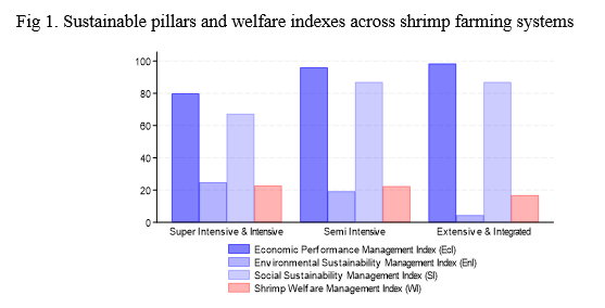Fig. 1 illustrates the mean values (range 0 - 100) of the sustainability (economic, environmental, social), and welfare management indexes across three shrimp farming systems . Overall, intensive farms require higher input costs and rely less on natural ecological processes while increasing their dependence on intensive feed and aeration, leading to the lowest economic index (Ngoc et al. 2023) . The environmental index is also less emphasized in intensive systems, as they focus more on maintaining pond water quality rather than promoting ecological balance. The shrimp welfare management index, however, is not much varied across all farming types, as econ-environmental priorities often take precedence over direct welfare investments.