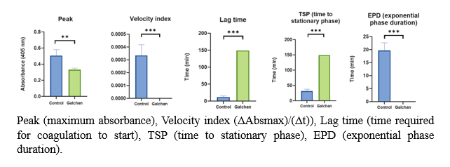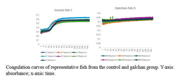 The findings indicate substantial differences between the control group and the two experimental groups across all examined parameters, underscoring the galchan group’s inability to induce coagulation under conditions identical to those of the control group. The primary objective is to utilize this assay in investigating the immunity of sea bream, as the procoagulant capacity of plasma has been associated with acute stress, potentially leading to mortality in fish through spontaneous thrombus formation due to elevated circulating adrenaline levels. In teleost, the anticoagulant capacity of plasma has been linked to liver damage, resulting in a reduced blood concentration of proteins involved in coagulation. In the absence of liver damage and hypocoagulability, it is proposed that the compounds evaluated in this assay may act as protective agents against thrombus formation. Based on the results, chitosan may serve as a protective compound against thrombus generation when liver damage is not present.