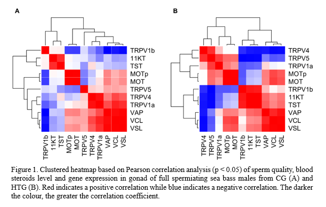 The transient receptor potential cation channels (TRPV) subfamily of ion channels is crucial in mediating temperature-sensitive physiological processes in fish species . In teleost , in silico analyses have identified three to four members of the TRPV subfamily: TRPV1 (TRPV1a and TRPV1b in some species), TRPV4 and TRPV5 (Morini et al., 2022) . As global climate change drives elevated water temperatures, concerns have grown over the potential impacts on gonadal development and spermatogenesis. To explore this, we studied how TRPV expression relates to androgens and sperm kinetics in male sea bass during their second year of growth, after being raised in warm water from an early age.