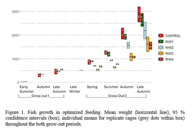 Control and RAS1 -groups had a good growth in optimised feeding. However, fish transferred as > 500g from RAS showed difficulties to adapt for the grow-out in sea cages (Fig.1)
