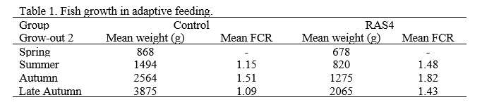 In adaptive feeding the differences in performance between Control and RAS4 were even more dramatic (Table 1.) even though fish had opportunity to adjust its feeding.