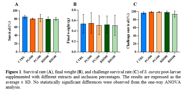 Considering the above, PG and RH were chosen as candidates for the in vivo assay. The results obtained so far show that supplementation with these extracts did not affect either growth or survival of seabream post-larvae. In addition, survival to a stressor such as air exposure was not affected either, with all groups showing values above 90%.