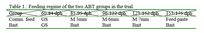 What became apparent already in the first and second feeding period from 60 and 85 dph onwards is the lower growth performance of the Comm. feed group. While the Bait group reached already 125g at 91 dph, the Comm. feed group only had 68g. The lower performance of the Comm feed group continued until 153dph. During all this time the specific growth rates (SGR) of the Comm. feed was 0.9% lower compared to the bait group.