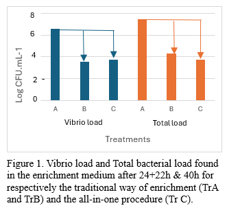 The use of EG SEP-Art® D-FENSE cysts during hatching, combined with the application of the CIP agent during traditional enrichment practices (Tr B) , resulted in a 3-log reduction in both Vibrio and total bacterial load compared to the control treatment (Tr A).