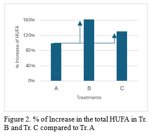 Enhancing water quality with the CIP agent significantly improved enriched Artemia nauplii. HUFA content increased by 60% in Tr B and 30% in Tr C compared to Tr A (Figure 2). Lower bacterial levels likely reduce HUFA utilization and conversion. Improved water quality correlates with increased vitality, better water filtration, and enhanced nutrient uptake, thereby enhancing nutritional value.