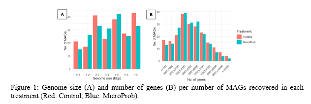 Water quality parameters remained within optimal levels for white shrimp culture. Shrimp growth performance showed no significant differences between treatments . In the metagenomic analysis, bacteria, archaea, virus, and eukaryotic organisms were identified from the raw reads. However, the MAGs assembly was limited to bacteria and archaea, constraining subsequent analysis. A total of 205 and 210 non-redundant MAGs were recovered from the MicroProb and Control treatments, respectively, with similar proportions of bacterial and archaeal genomes (198 bacterial and 7 archaeal MAGs in MicroProb ; 204 bacterial and 6 archaeal in Control). Analysis revealed 26 MAGs exclusive to MicroProb , 28 exclusive to Control, and 19 shared across both treatments. MAG quality metrics, including completeness and contamination, were comparable between treatments. However, MicroProb showed a greater concentration of genomes with intermediate sizes (4–5 Mbp) (Figure 1A) and gene counts (3,000–6,000 genes) (Figure 1B), suggesting a more uniform and potentially functionally balanced microbial community. In contrast, the Control treatment showed a greater number of highly fragmented MAGs and genomes with extreme sizes.