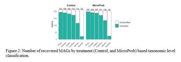 Taxonomic classification was highly effective at higher taxonomic levels, successfully assigning approximately 89% of MAGs to the family level in both treatments. A total of 30 phyla, 56 classes, 91 orders, 118 families, and 24 species were identified. However, a substantial proportion of MAGs remained unclassified at the genus and species levels, indicating the presence of potentially novel or poorly characterized taxa (Figure 2). Dominant bacterial groups shared across both treatments included Pseudomonadota , Bacteroidota , and Planctomycetota (phylum level), Gammaproteobacteria (class), and Pseudomonadales (order), which are commonly reported in BFT systems (Baliga et al., 2021; Ghonomy et al., 2023). Notably, MicroProb displayed a higher abundance of families such as Halieaceae , Saprospiraceae , and Woeseiaceae (>5 MAGs), which were present only at low abundance in Control. These families have been linked to key ecosystem functions in BFT: Halieaceae and Saprospiraceae contribute to ammonium removal, while Woeseiaceae has been associated with anaerobic denitrification, enhancing nutrient recycling and system sustainability (Rajeev et al., 2024).