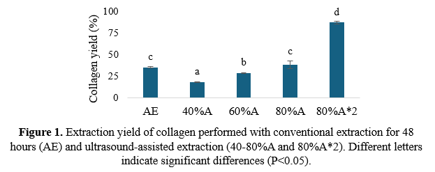 Collagen ultrasound- assisted extraction was then performed on 10 g of pretreated skins with 100 mL of 0.5 M acetic acid at 4 ºC. Both c onventional acid extraction (AE) and ultrasound- assisted extraction at three amplitudes (40%A, 60%A and 80%A) were assessed . Re-extraction of collagen was also evaluated (80%A*2) , the solid residue obtained after the initial extraction at 80% was subjected to a second extraction with 100 mL of fresh acetic acid solution under the same conditions for 10 minutes . The collagen yield was calculated based on hydroxyproline content in the extraction supernatant following the method described by Cissell et al. (2017). The molecular weight distribution of the extracted collagen was analyzed with SDS-PAGE.