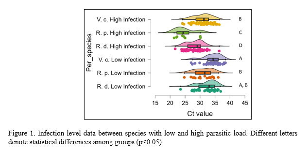 Regarding microbiota community, there is no clear impact on the composition after infection, but some groups seemed to be modulated by the parasite infection. On the other hand, there is a clear separation of the microbiota composition among species (Figure 2).