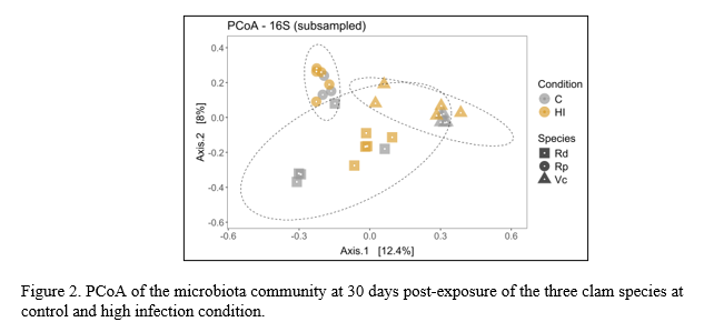 After isolation of parasite hypnospores2, two different concentrations were added to tanks (Low Infection (LI) treatment 5x105 cells; High Infection treatment (HI) 5x106 cells). After 48 hours, water was renewed, and the progression of the infection was followed for one month. Samples were taken over four time periods (48 hours, 7-, 14- and 30-days post exposure) to assess short and longer-term responses. Presence and prevalence of parasite over time was evaluated by qPCR3 . Also, RNA was extracted from samples of 48 hours and 30 days’ post exposure. T he microbiota community was evaluated by the sequencing of the V3-V4 region of the 16S after isolating the DNA from the whole clam at 30 days’ post-exposure in control and HI treatment to verify if the infection had an impact on the community.