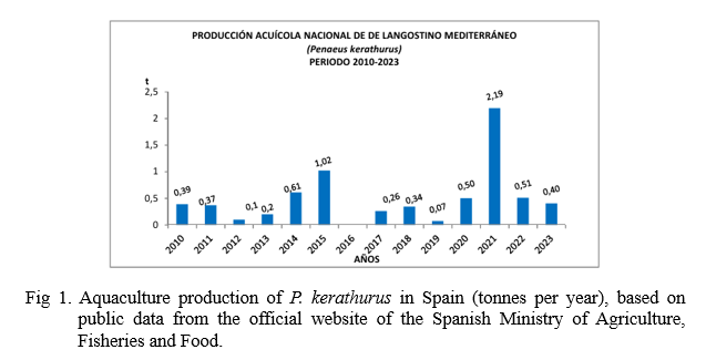 In this work, a comprehensive literature search about P. kerathurus was conducted, focusing on enabling its cultivation under controlled conditions and ultimately achieving full life cycle closure in captivity. In addition, data from both extractive fishing activity and fattening practices in recent decades were obtained from the official website of the Ministry of Agriculture, Fisheries and Food of the Government of Spain. Literature review carried out using the electronic databases Scopus and PubMed to identify relevant scientific publications on the biology and ecology of the species. For this, ‘Penaeus (Melicertus) kerathurus’ AND ‘aquaculture’ were used as keywords, restricting publication time between 1980 and 2024. Initial screening focused on studies addressing the species biology and ecological characteristics. Subsequently, a more refined search was conducted to identify literature related specifically to breeding techniques and captive rearing practices attempted to date. Articles were selected based on their relevance to the scope of the review, prioritising those that presented empirical findings, practical methodologies, or reviews of aquaculture strategies applicable to the target species.