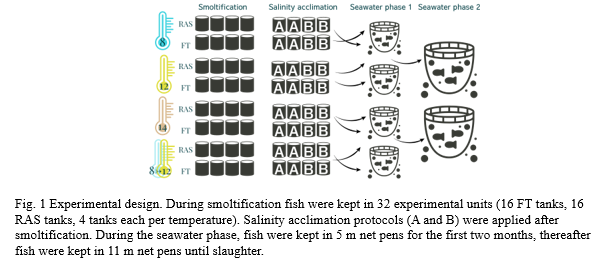Atlantic salmon smolt production in Norway has been intensified over the past years and has led to concern about increasing prevalence of life-style disease s in cultured Atlantic salmon (Frisk et al. 2021) . Temperature and water salinity are critical rearing parameters that differ between smolt hatcheries (Kristensen et al. 2011) and directly affect Atlantic salmon physiology. While several studies have examined these factors in short-term experiments (Handeland et al. 1998 , Handeland et al. 2000) , there is limited documentation on how smolt rearing history changes long-term growth, welfare, and slaughter quality . In this study, we evaluated the short- and long-term effects of four temperature groups: 8°C, 12°C, 14°C, and a group with temperature increased from 8°C to 12°C. We hypothesized that lower rearing temperature in fresh water would result in better growth at sea. In addition, we evaluated the potential benefits of acclimatizing smolts to salinity prior to seawater transfer. All treatments were assessed in both flow-through (FT) and RAS systems.
