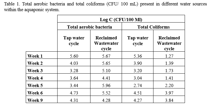 Regarding bacterial load in water within the aquaponic system, total aerobic bacterial growth was slightly higher in the reclaimed water cycle, as this type of water initially contained a certain microbial load. However, levels gradually stabilized over time, reaching values comparable to those observed in the tap water production cycle. This is a highly positive indicator of the water quality within the system. Notably, no significant pathogens such as Escherichia coli ,Salmonella , Clostridium perfringens, MS2 coliphage, Enterococcus were detected in any of the water sources. On the other hand, during the first weeks of the cycle, reclaimed water has fewer coliform bacteria compared to the aquaponic cycle with tap water. However, over the weeks, coliform levels in both cycles become similar.