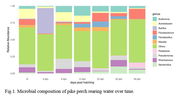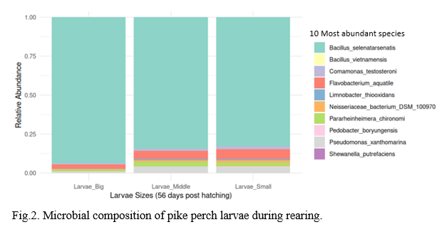 Preliminary results showed that microbial analysis of pikeperch larvae revealed shifts in bacterial composition over time and differences by size at 56 dph, highlighting the emergence of Flavobacterium infections at later growth stages. Flavobacterium and Pseudomonas increased in abundance from 12 dph onwards, with early stages showing more diverse profiles. By 23 dph, these genera dominated, likely due to changes in environmental conditions or feeding. The shift towards Flavobacterium suggests a potential risk for emerging infections at later stages of growth.