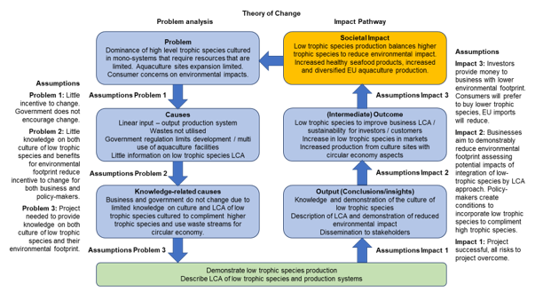 At the heart of the required changes is the industries’ ambition to sustainably intensify production activities and maximise economic return, together with society’s legitimate expectations to see the environmental footprint of goods and services being reduced. BLUEBOOST proposes to accelerate change in the aquaculture industry by addressing significant knowledge gaps that exist in the conceptual development, practical implementation and regulation of integrated aquaculture systems (Problem analysis) to provide outcomes and a clear pathway to change. BLUEBOOST outcomes predict the aquaculture industry will improve environmental credentials of businesses and products, consumers will demand low-carbon impact products and business investments and policymakers will provide a positive environment for the co-culture of low trophic and established species and deploy regulation to capture waste and reduce pollution. Therefore, Government policy and changing expectations of investors and consumers will drive aquaculture transition to carbon neutrality as shown in the impact pathway in the Theory of Change figure. This win-win scenario will deliver improved diversification of blue food / feed products and, at the same time, will increase production volumes to improve business economic returns combined with a reduced environmental footprint. Therefore, BLUEBOOST can deliver a concrete roadmap for the aquaculture industry to demonstrably reduce its environmental impact and increase sustainable blue food and feed production that can lead to societal transformation.