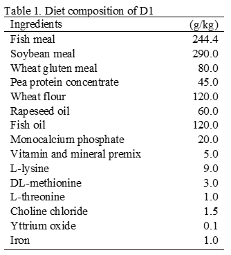 The diets were produced by extrusion at Fôrtek (Center for Feed Technology, NMBU, Aas, Norway), with a 2mm die and with a final diameter of ca. 2.4mm. After drying until 8-10% moisture, pellets were vacuum coated with fish oil and rapeseed oil.