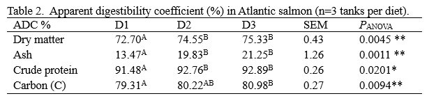 Digestibility: The apparent digestibility coefficients of dry matter, crude protein, ash, and carbon increased significantly in fish fed diets D2 and D3 (Table 2). This improved digestibility suggests a better nutrient utilization when Atlantic salmon diets are supplemented with biochar.