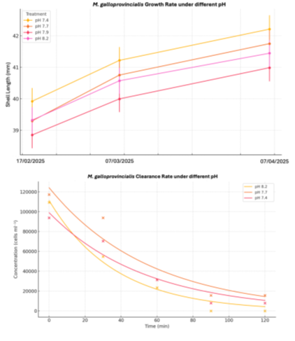 Over seven weeks, the animals grew at identical rates (~0.05 mm day⁻¹, ≈ 2.3 mm total) across seawater pH 8.2–7.4, indicating short-term shell-length growth is insensitive acidification. Yet feeding assays revealed a ~35 % drop in clearance rate below ambient pH, suggesting energy acquisition is already compromised. This divergence implies mussels can initially maintain shell extension by reallocating resources, but longer or multi-stress exposures may reveal hidden costs. Thus, while early growth appears resilient to near-future ocean acidification, reduced feeding efficiency emerges as an early warning signal.