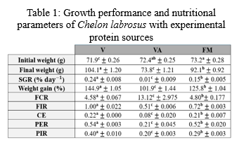 Growth performance and nutritional parameters of Chelon labrosus with experimental protein sources.