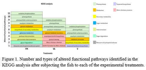 As for the taxonomical groups found in the fish GIT, all experimental treatments modified the initial fish gut microbial community. However, slight biodiversity differences were observed between the three analyzed treatments (figure 1). Despite not having found any significant difference between the treatment’s taxonomical biodiversity, the COGs and KEGGs terms analysis suggest that the experimental diets could have an effect in the fish gut microbial’s community functionalities.