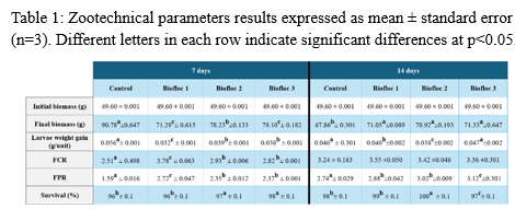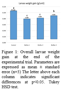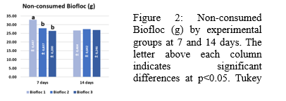 As shown in Table 1, control group s reached higher final biomass levels and provided lower FCR and FPR values during the first and second week of the experimental trial, reaching bigger larvae sizes too (Figure 1) . In contrast, biofloc and wheat bran fed groups showed higher FCR and FPR values, indicating a lower feed conversion efficiency and confirming that some of the administered biofloc was not turned into biomass. However, biofloc was consumed at a higher rate when administered more frequently and no mortality rate could be observed in any of the experimental groups (Fig ure 2).