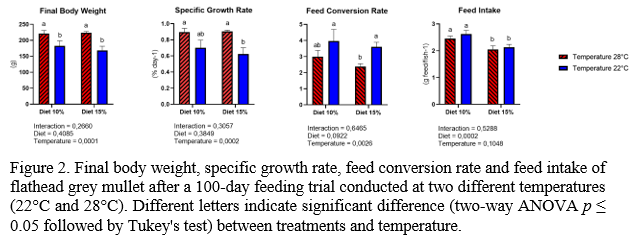 In conclusion, the growth of the mullet at 28°C remained consistent across both dietary treatments. However, considering feed conversion ratio and feed intake, fish exhibited improved growth when provided with a diet containing 15% lipids at this temperature. A comprehensive understanding of the protein and energy requirements of this emerging species at varying temperatures is essential for optimizing growth performance and developing effective aquaculture practices.