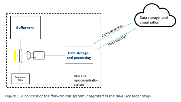 The technology includes a water filtering system that automatically cleans the filters by reversing the flow direction through the filter, re-directing it to a buffer tank where sea lice and other particles with the seawater can pour through to an interchangeable filter bag , essentially up concentrating the seawater . The system is capable of pumping 900 L/m, meaning when implementing the flow-through imaging system between the buffer tank and the interchangeable filter (see Fig. 1) , we are also capable of imaging and processing 900 L/m.