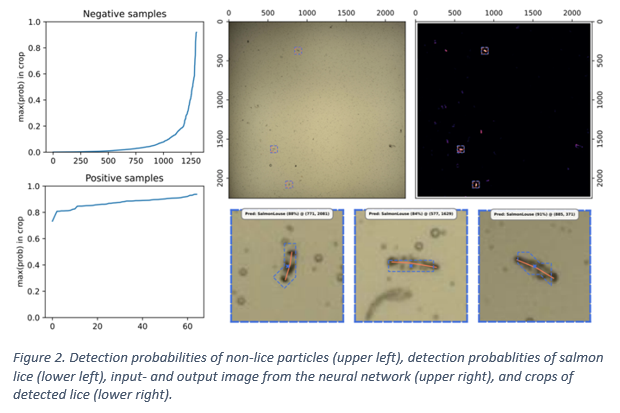 So far, a prototype has been thoroughly tested in a lab environment at SINTEF SeaLab in over 200 simulated filter cleaning operations . In this process, we have gathered over 150.000 images of seawater containing salmon louse copepodids and nauplii, copepods (Acartia tonsa) and preserved samples collected from the Blue Lice technology deployed at a fish farm. The data has been used to train a neural net (FCN; Fully Convolutional Network) to automatically detect sea lice (Fig. 2).