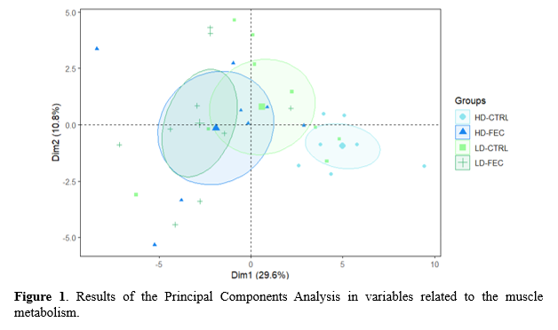 A multivariate analysis (PCA) was performed to unravel hidden patterns in muscle metabolism (Figure 1) , including enzymatic activities and fatty acids profiles. T he use of dietary FEC modulates the effect of high stocking density o n muscle metabolism, as a differentiation was observed between high stocking density control group and the other three experimental conditions. To conclude, these results support that dietary FEC phytogenic proto type can improve lipid management and nutritional profile in seabass, especially under chronic stress conditions by high stocking density.