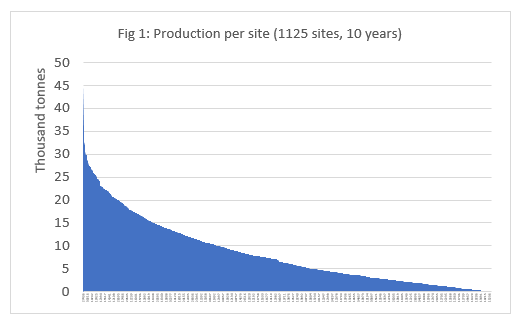 The production capacity of the site as defined by the aquaculture license (which is in terms of the maximum biomass in tonnes that can be held at the site at any given time), but real production capacity varies much more than licensed capacity, dependent on depth, currents, how long fallowing periods are needed between generations to restore sea bottom conditions, average lice numbers on the salmon in the farm and the need for lice treatments to stay within the mandatory limits, disease outbreaks et.c. Revealed capacity is illustrated in figure 1 (each site on the x-axis). This shows the combined production for each site over the last ten years. Production ranges from close to 45.000 tonnes, or 9000 tonnes over each two-year production cycle. Only 1/3 of the sites have shown a production of more than 10.000 tonnes for these ten years.