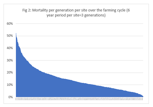 The analysis will describe the distribution of growth rates, mortality, feed conversion ratio, smolt yield et.c., and analyze how these parameters are explained by temperature, lice prevalence et.c. Even for these factors variation is huge, as exemplified by mortality in figure 2. Mortality ranges from over 50 % down to 1-2 % for the best sites.