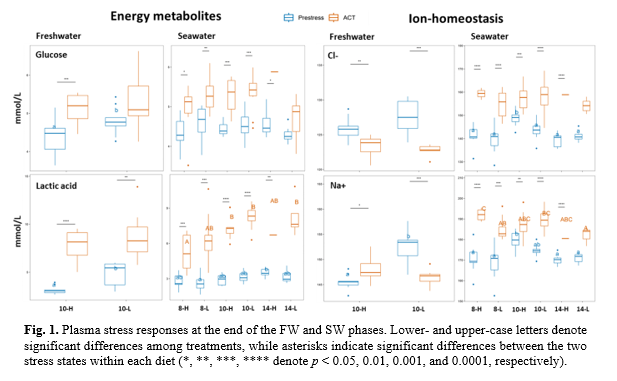 Plasma ions and metabolites: In FW, plasma glucose, lactic acid, and Na+ levels were lower in response to the high-water velocity (Fig. 1). This may indicate larger energetic demands and disturbed ion-homeostasis, effects consistent with osmo-respiratory compromise. In SW, the pre-stress 10-H group at 10°C showed a general elevation in plasma ions suggesting increased osmoregulatory challenges (Fig.1). Conversely, lactic acid levels were highest in the 14°C group following the ACT, while the high-water velocity seemed to elevate lactic acid build-up at pre-stress status in the 14-H group (Fig. 1). This build-up in lactic acid may be a consequence of thermal increases in metabolic rate alongside higher energetic demands to sustain swimming activities that elevate anaerobic forms of metabolism.