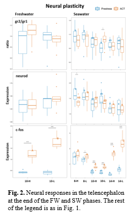 Atlantic salmon parr (initial body weight ̴ 40g) were allocated in duplicates between two water velocities (body length [BL] / second [s]): 1) H (1.2 BL/s) and 2) L (0.6 BL/s). The fish were maintained under these conditions at 10°C in FW RAS for 8-weeks. During this period fish were smoltified according to standard industry practice, followed by SW transfer of smolts in the same respective water velocities. To investigate the effect of abrupt temperature changes that often results from transfer from land-based sites to sea-cages, we investigated three distinct temperature regimes (1) 8°C [8-H & 8-L], 2) 10°C [10-H & 10-L] and 3) 14°C [14-H & 14-L]). The fish remained under these conditions for an additional 8-weeks before final sampling. At the end of both FW and SW phases, 20 fish from each treatment (N=5 per tank) were sampled for blood and brain tissue. In each treatment, 10 fish were immediately euthanized (pre-stress) and the other 10 were subjected to an acute challenge test (ACT), by high density, to monitor stress response capacities (ACT; 15 min. at 300 kg. m-3, followed by 45 min. recovery). Plasma levels of cortisol were measured using ELISA, and ions (e.g., sodium, chloride) and energy metabolites (e.g., glucose, lactic acid) analysed using Horriba Pentra 400. These were compared to telencephalic expression changes in genes involved in the stress response (mineralocorticoid receptor; mr, glucocorticoid receptors; gr1 and gr2) and neural plasticity (e.g., neurogenic differentiation factor; neurod, e.g., immediate early gene [IEG]; c-fos). Data was subjected to one- and two-way ANOVAs (p < 0.05).