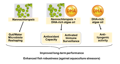 Nannochloropsis supplementation largely reshaped the microbiota inhabiting the intestine and the water environment, promoting in turns a healthy intestinal core microbiota. Microalgae biomass, together with DHA-rich algae oil, would drive the expression pattern of key enzymes of lipid metabolism, antioxidant defence and immunological surveillance, while changes in lipid metabolism could be primarily attributed to a dietary surplus of PUFA rather than to an increased supply of microalgal biomass.