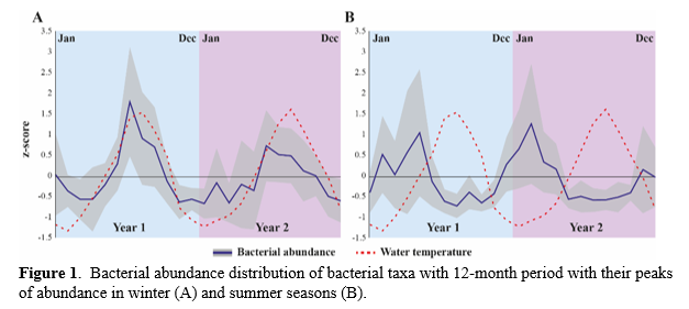 Microbiome composition of inlet and rearing water showed a dominance of three main phyla: Pseudomonadota , Bacteroidota , and Cyanobacteria. Similarly, the skin microbiota maintains the dominance of the first two phyla, while the presence of Cyanobacteria was significantly lower, being replaced by the Bacillota phylum. In terms of OTU prevalence, 130 taxa at genus level were shared consistently between water and the skin mucus. Interestingly, the abundances of 94 taxa (approximately 70% of the total shared microbiota) were positively or negatively correlated between skin and rearing water microbiomes. To refine this set of bacteria select ed across time , we applied a time series analysis (RAIN analysis; Coenen et al., 2020) to seawater inlet samples collected across two consecutive years. As a result, among a list of 102 genera (p < 0.01) whose abundances were positively (Figure 1A) or negatively (Figure 1B) correlated with seawater temperature, 24 taxa exhibited the same seasonal variation in the skin mucus and rearing water microbiomes. These bacteria (representing 21.1 and 16.8% of the total water and skin abundance) are relevant because apart of being consistent in our facilities environment, can be measured in the rearing water as a non-invasive proxy of a host-associate microbiome.