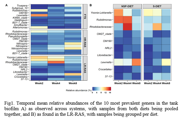 By the end of the trial, tank biofilm in the LR-RAS showed the highest microbial abundance and a trend toward higher organic carbon levels, indicating that nutrient accumulation promotes biofilm growth. Alpha diversity also varied most in the LR-RAS, with a short-term decline linked to the NSP-DIET. This contrasted with trends observed in the tank water—where alpha diversity fluctuated more under higher water refreshment rates—suggesting that biofilm and water microbial dynamics are likely independent of each other. Beta diversity in tank biofilm shifted over time across all systems, with each maintaining distinct prokaryotic communities throughout. Despite these shifts, the relative abundance of dominant taxa remained stable and included no known gilthead seabream pathogens (Fig1A), even though potentially pathogenic bacteria (e.g. Vibrio, Coxiella) were detected in water from the two RAS. Differences among systems were partly explained by physicochemical water quality parameters, with organic carbon and nitrogen levels strongly shaping biofilm prokaryotic communities in the two RAS. In the LR-RAS, diet also influenced biofilm community structures (Fig1B). Nonetheless, it did not promote the presence of common sulphate-reducing (i.e. Desulphobacteroda) or off-flavor producing (e.g. Oscillatoria perornata, Anabaena spp., and Pseudanabaena) bacteria, which remained at low relative abundances in all systems, despite their frequent presence in previous biofilm studies (Houle et al., 2011; Rojas-Tirado et al., 2021). Overall, the present findings highlight that environmental conditions are the primary drivers of biofilm development in aquaculture systems, while diet plays a secondary but notable role under low water exchange.