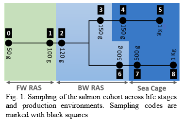A fish cohort from a commercial production facility was monitored from the parr stage in freshwater (FW) RAS through transfer to brackish water (BW) RAS. T wo transfer strategies were applied: release of small (150 g) or large (500 g) smolts to sea cages (SC). Sampling points are depicted in Fig. 1 and were as follows: A) FW RAS: parr at 50 g ( Code 0) and 100 g just before transfer to BW ( Code 1) ; B) BW RAS: one week after transfer ( Code 2) and just before seawater transfer (SWT) at either 100 g ( Code 3) or 500 g ( Code 6); and C) SC: at one week ( Codes 4 & 7) and six months after SWT ( Codes 5 & 8). Fish weight and somatic indexes were recorded. Three sample sets were collected: plasma for general welfare assessments and water and feces for microbiome analysis. F eces were collected from the posterior intestine. Total genomic DNA was extracted for metataxonomic, DNA amplicon libraries were generated targeting the V3-V4 regions (341F/R805) of the 16S rRNA gene, and the sequencing was performed on the Illumina platform. Analysis of the sequences was performed following standards pipelines for metataxonomic analysis. Clean sequences chimeric detection and deletion, followed by Amplicon Sequence Variant (ASV) assignment was completed using the DADA2 plugin. Taxonomy was assigned with a 99% similarity level using the q2-feature-classifier plugin with the SILVA138 database. Alpha (Shannon) and beta (Bray Curtis) diversity indices were calculated using the vegan R package.