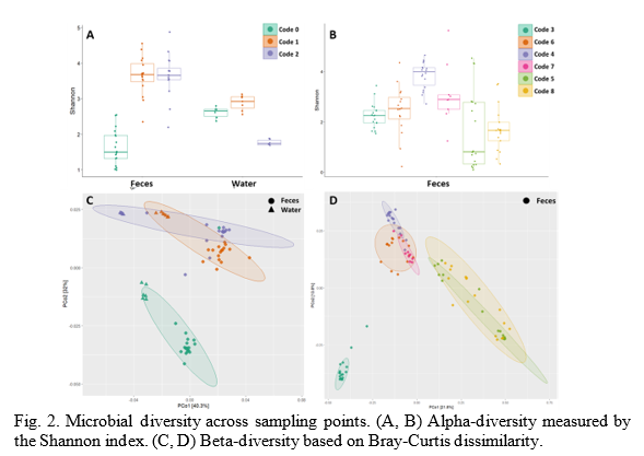 Alpha-diversity was low in the salmon gut microbiota at the early parr stage (Code 0) (Fig. 2A) and closely resembled the RAS water, being largely dominated by Aurantimicrobium (data not shown). From the smolt stage onwards (Code 1), the microbiota became more diverse and increasingly distinct from the surrounding water , despite the BW being less diverse than the FW. Beta-diversity revealed significant differences among Codes 0, 1, and 2, with the most pronounced difference observed between Codes 1 and 2 (Fig. 2C).