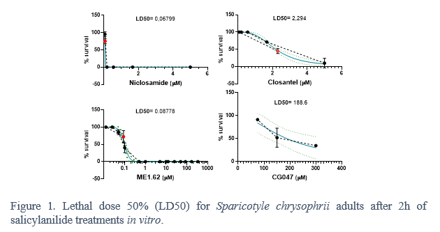 Three of the 4 salicylanilides tested resulted highly effective killing the parasites in vitro . According to their LD50 at 2h p.e , they ranked as follows (Figure 1) : niclosamide (0.06792 µM) , ME1.62 (0.08778 µM), closantel (2.294 µM) and CG047 (188.6 µM).